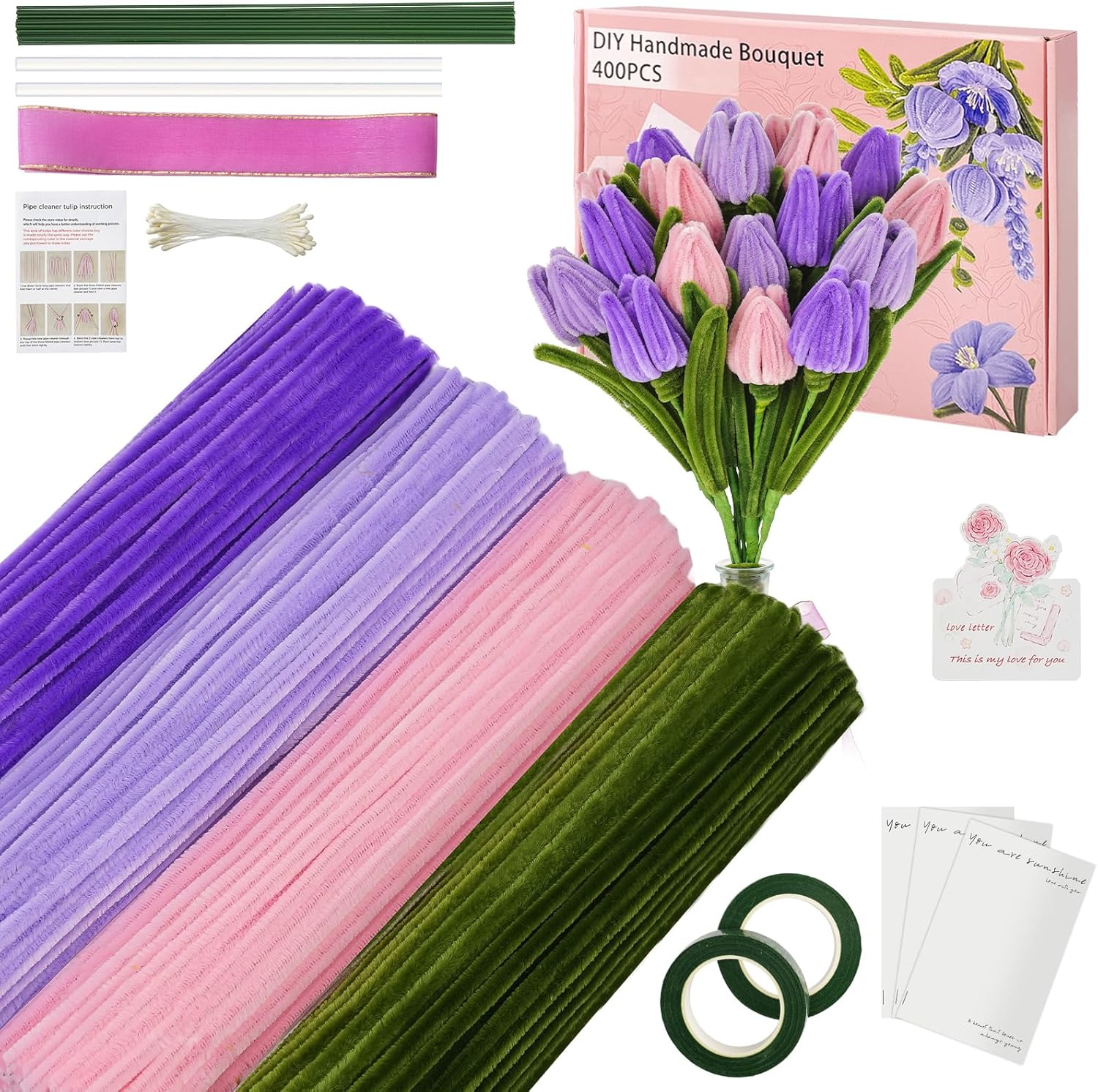 - đăChenille Pipe CleanersăThe product includes all crafting accessories for tulip bouquets: 400pcs pipe cleaner,20pcs floral Wires, 2pcs gardening tape,2pcs hot glue Sticks,1pc greeting card,3pcs bouquet paper, 1 bag stamen ,1pc Ribbon,&1pc instrution.