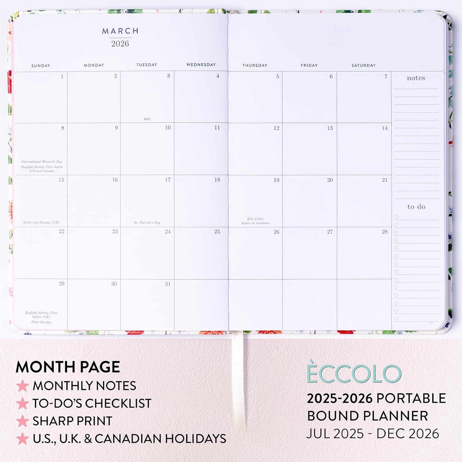 2025-2026 Eccolo 18 Month Bound Planner, Monthly & Weekly Pages (5.25 x 7.75" - July 2025 to Dec 2026 - Watercolor Flowers)