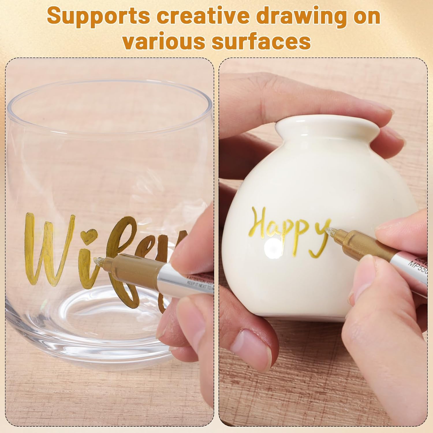 - 【Multi-Surface Gold & Silver Pens】Create permanent metallic finishes on glass, ceramic, wood, plastic, and fabric. Ideal for DIY mugs, Halloween pumpkins, Christmas ornaments, and scrapbooking. Gold shades may vary from sunshine yellow to deep antique tones for artistic versatility