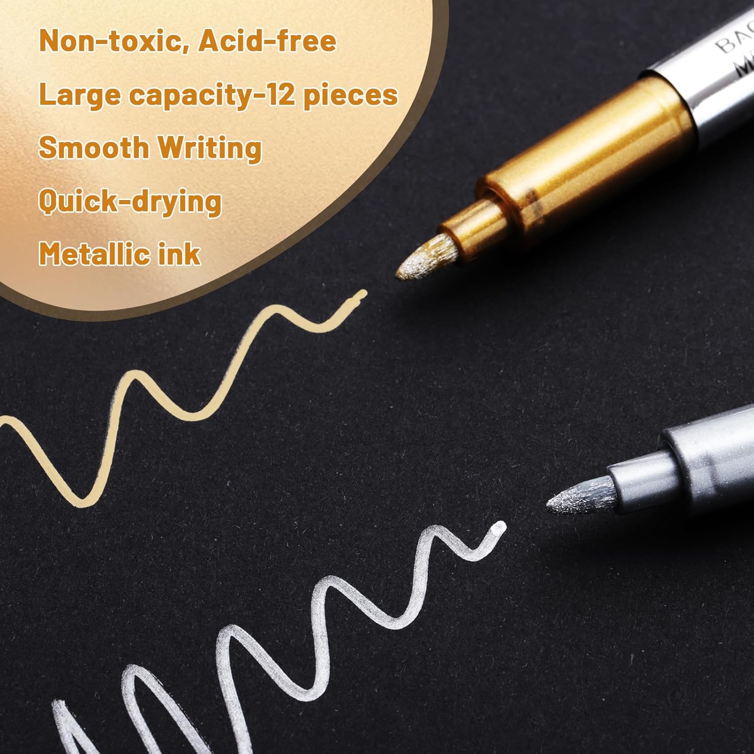 12 Pack Metallic Markers Pens, Water Based Silver & Gold Paint Pens, Gold & Silver Ink Pen with Durable Fine Point Tip for Black Paper, Rock Painting, Halloween Card Making, Multi Surface Art Crafts