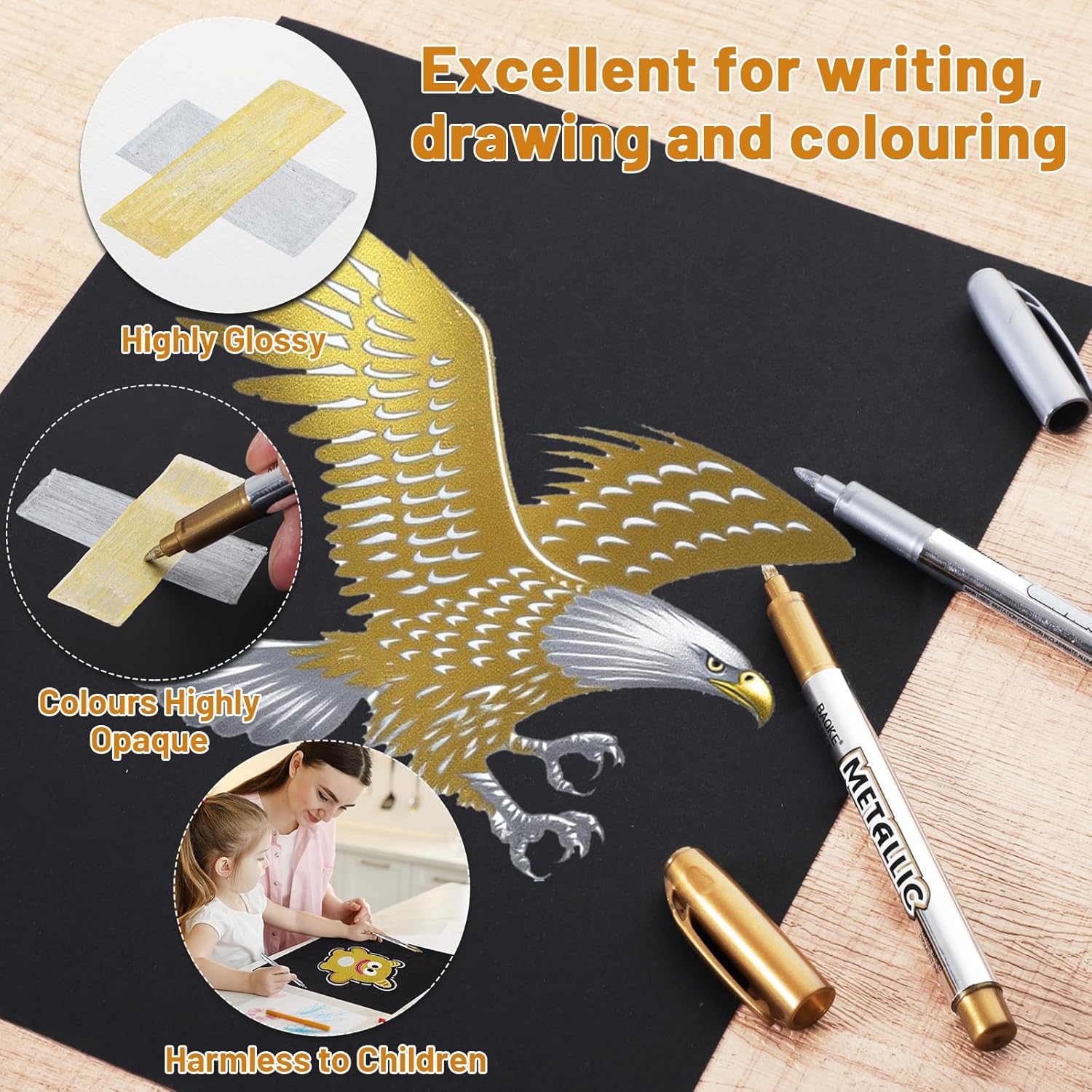 - 【Vibrant Metallic Marker Pens】Achieve dazzling silver & gold effects on any surface with these quick-drying paint pens. The durable 1.5mm fine tip delivers precise lines for rock painting, black paper art, and holiday crafts. Water-based ink resists fading without bleeding through paper