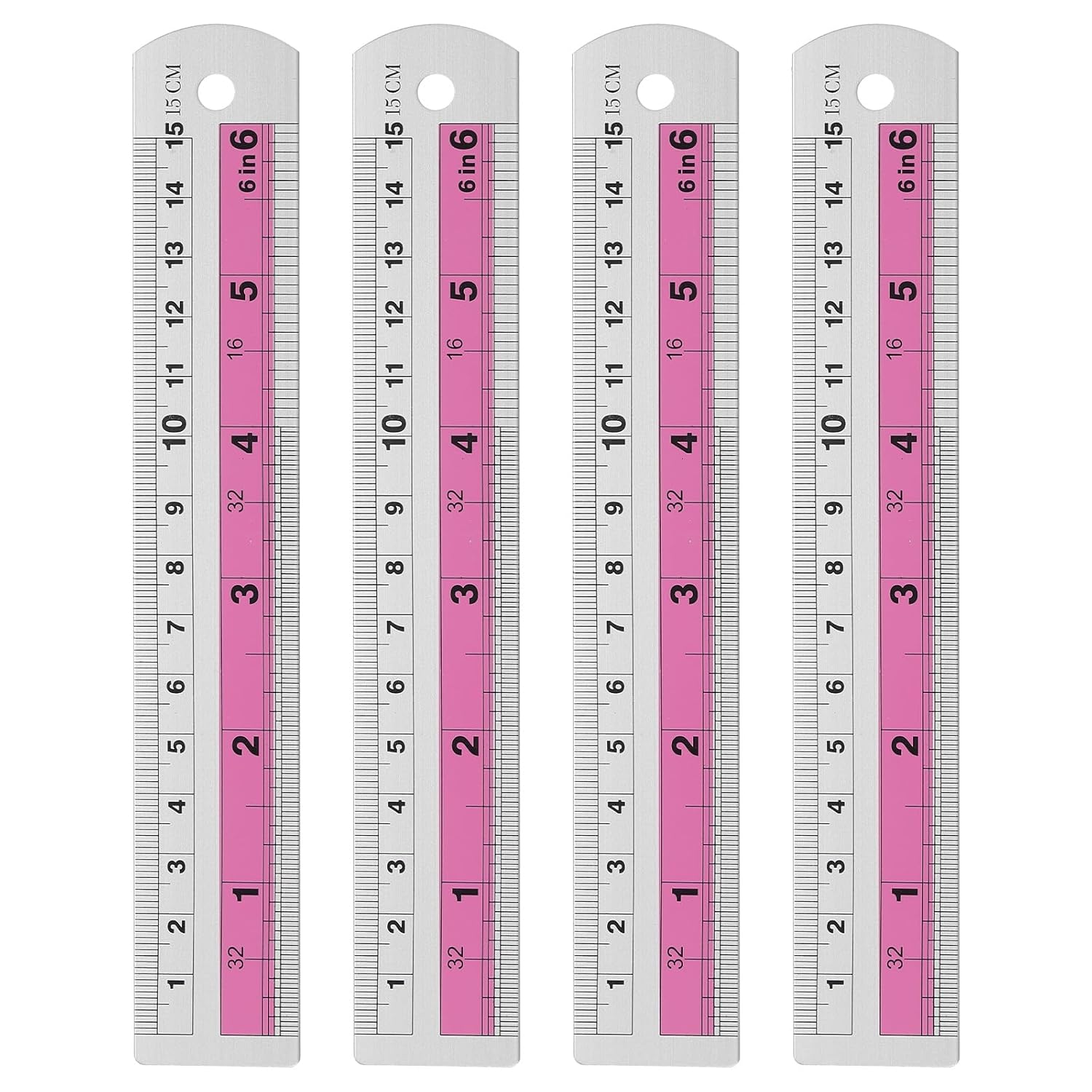 HARFINGTON 4pcs Metal Straight Ruler 15cm Metric SAE Aluminum Alloy Measuring Rulers Scale Tools with Hole for Measure Study Reading Classroom Office, Pink