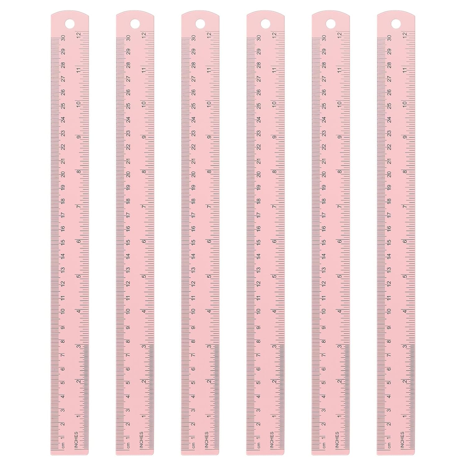 HARFINGTON 6pcs Metal Straight Ruler 30cm Metric SAE Aluminum Alloy Measuring Rulers Scale Tool with Hole for Measure Study Reading Classroom Office, Pink