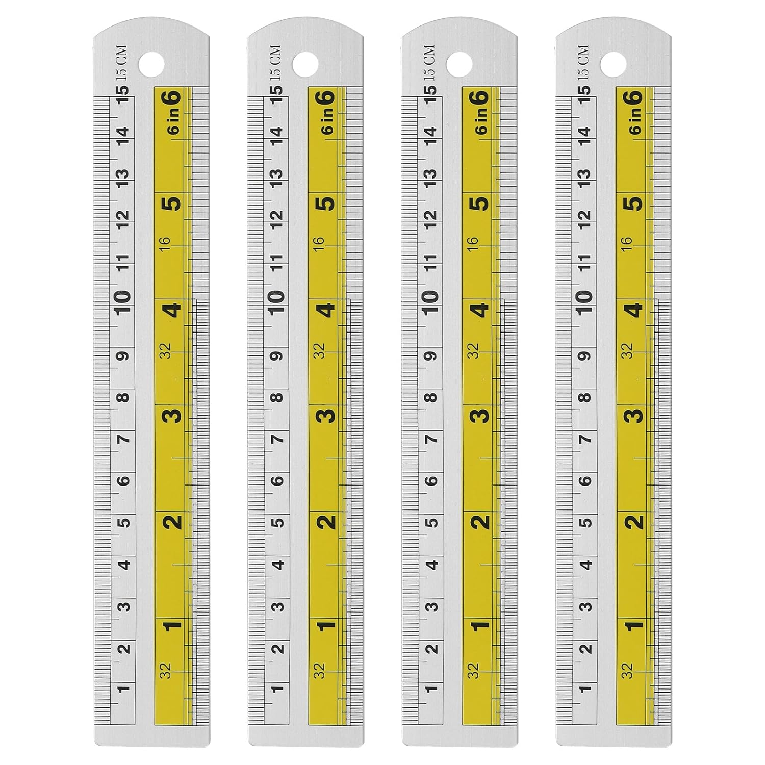 HARFINGTON 4pcs Metal Straight Ruler 15cm Metric SAE Aluminum Alloy Measuring Rulers Scale Tool with Hole for Measure Study Reading Classroom Office, Yellow