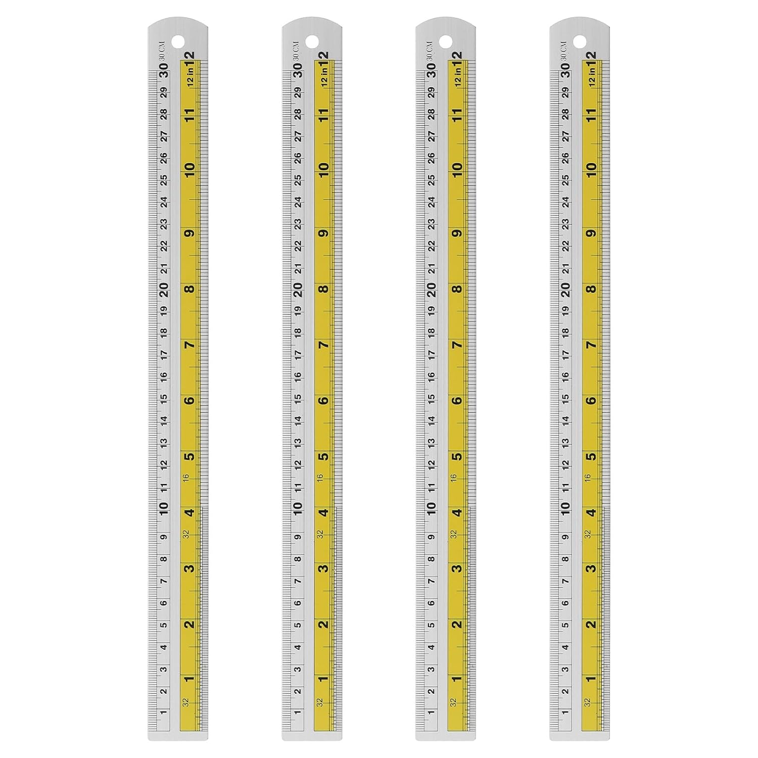 HARFINGTON 4pcs Metal Straight Ruler 30cm Metric SAE Aluminum Alloy Measuring Rulers Scale Tool with Hole for Measure Study Reading Classroom Office, Yellow