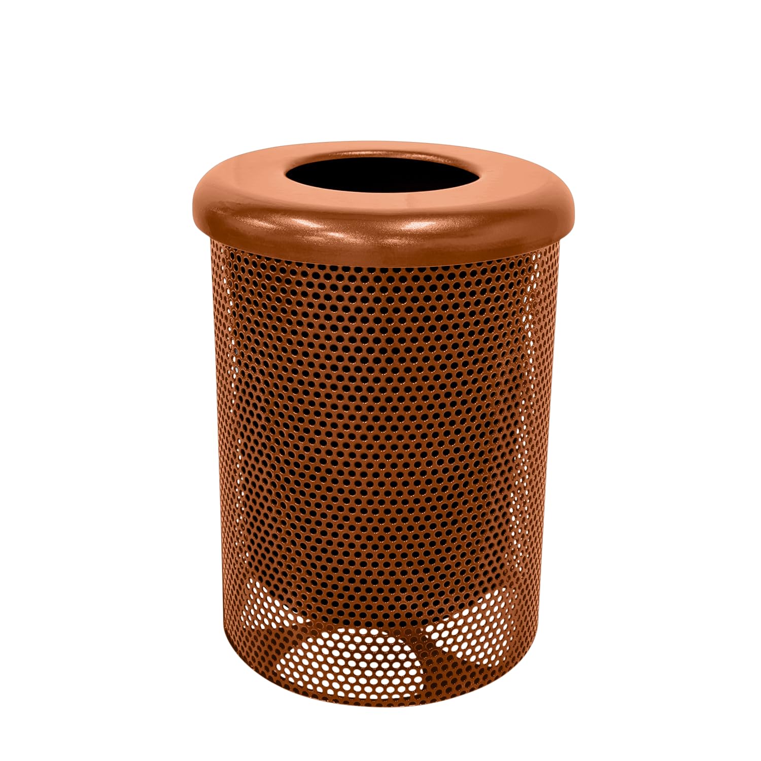 32-Gallon Heavy-Duty Punched Steel Round Trash Receptacle, Commercial Outdoor Waste Bin with Liner & Black Flat Top Lid – Made in America (Textured Copper)