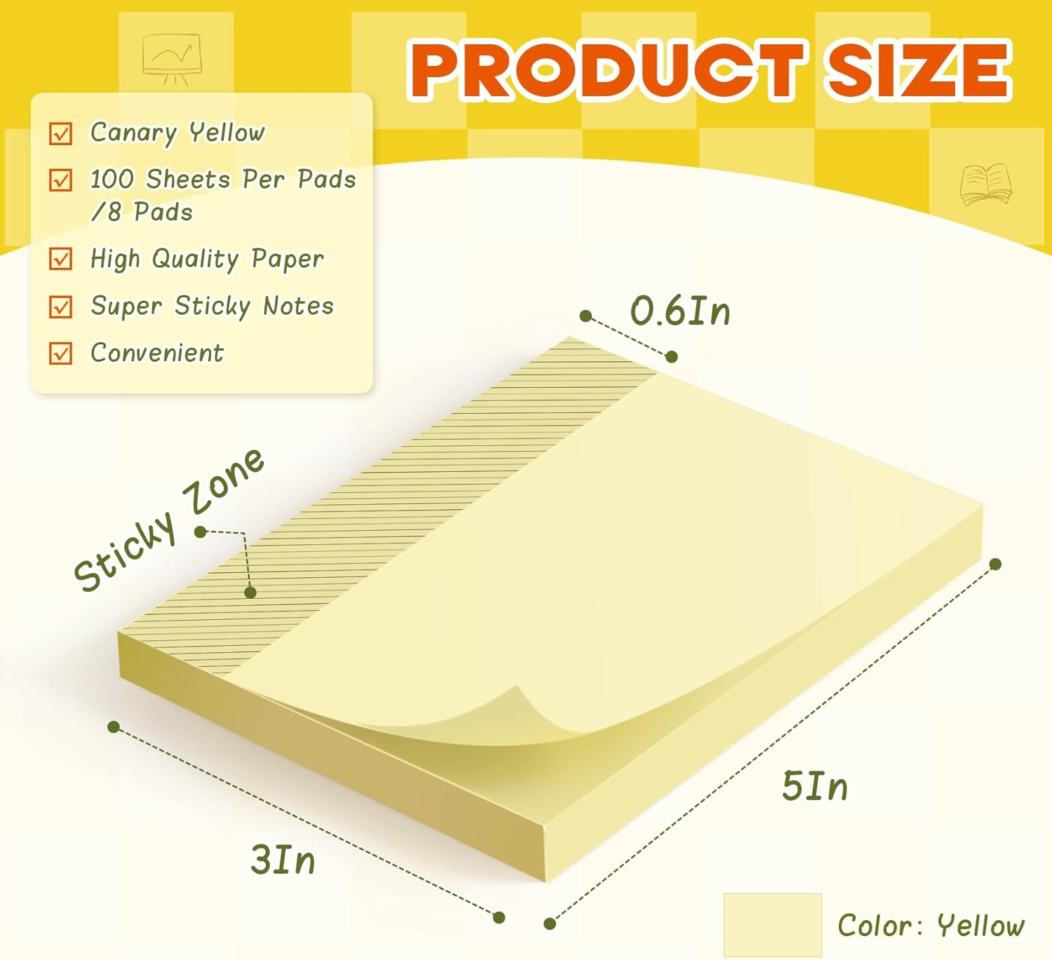 (8 Pack) Large Sticky Notes 3x5 in Yellow, 800 Pcs Self-Stick Notes,100 Sheets/Pad Super Adhesive Sticky Pads Recyclable for Home, Office, Notebook, Clean Removal