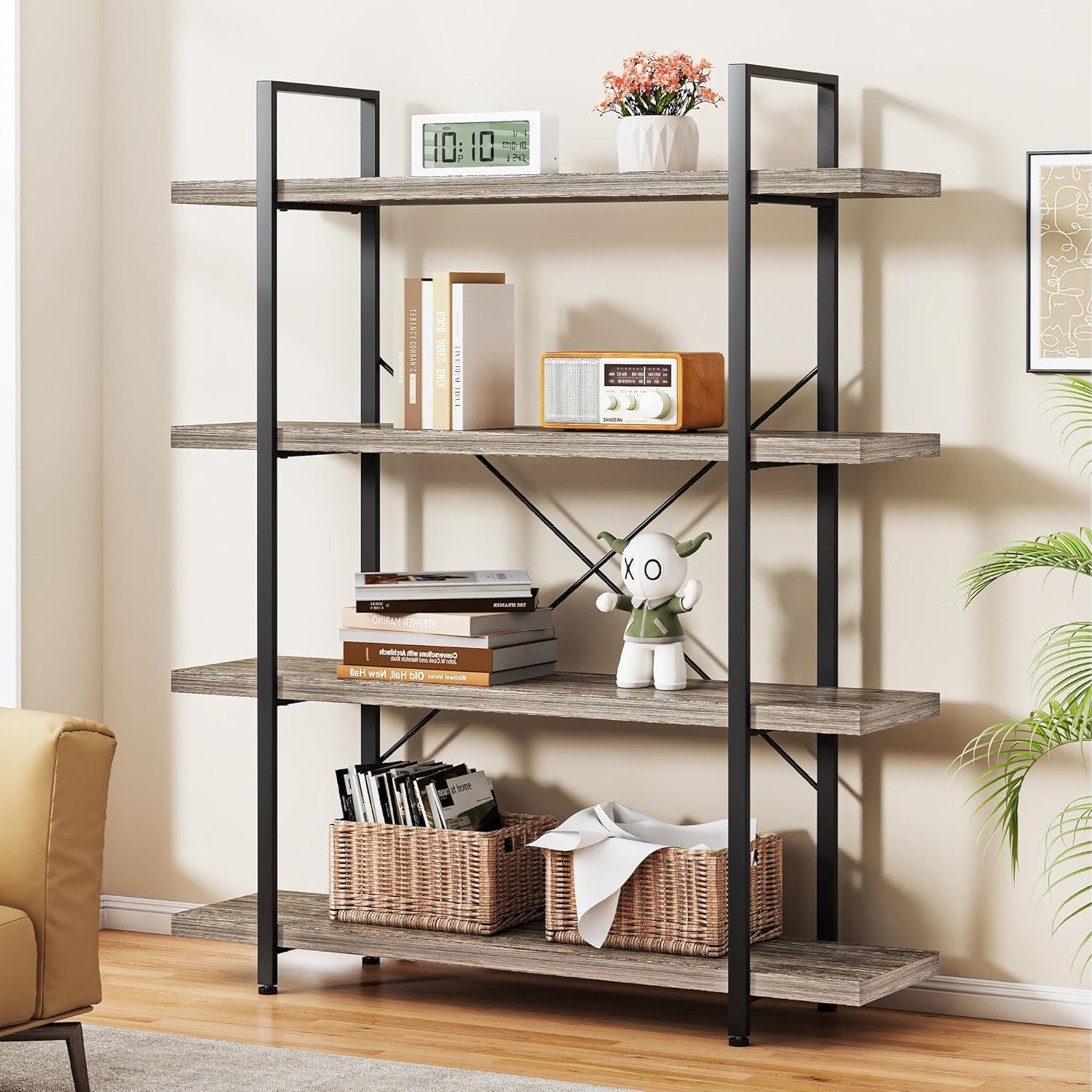 Heavy Duty 4-Tier Industrial Bookcase, 47" Wide Wood Bookshelf for Home Office, 120lbs Shelf Capacity, Rustic Shelving Display with Reinforced Horizontal Shelf for Living Room Bedroom,Grey