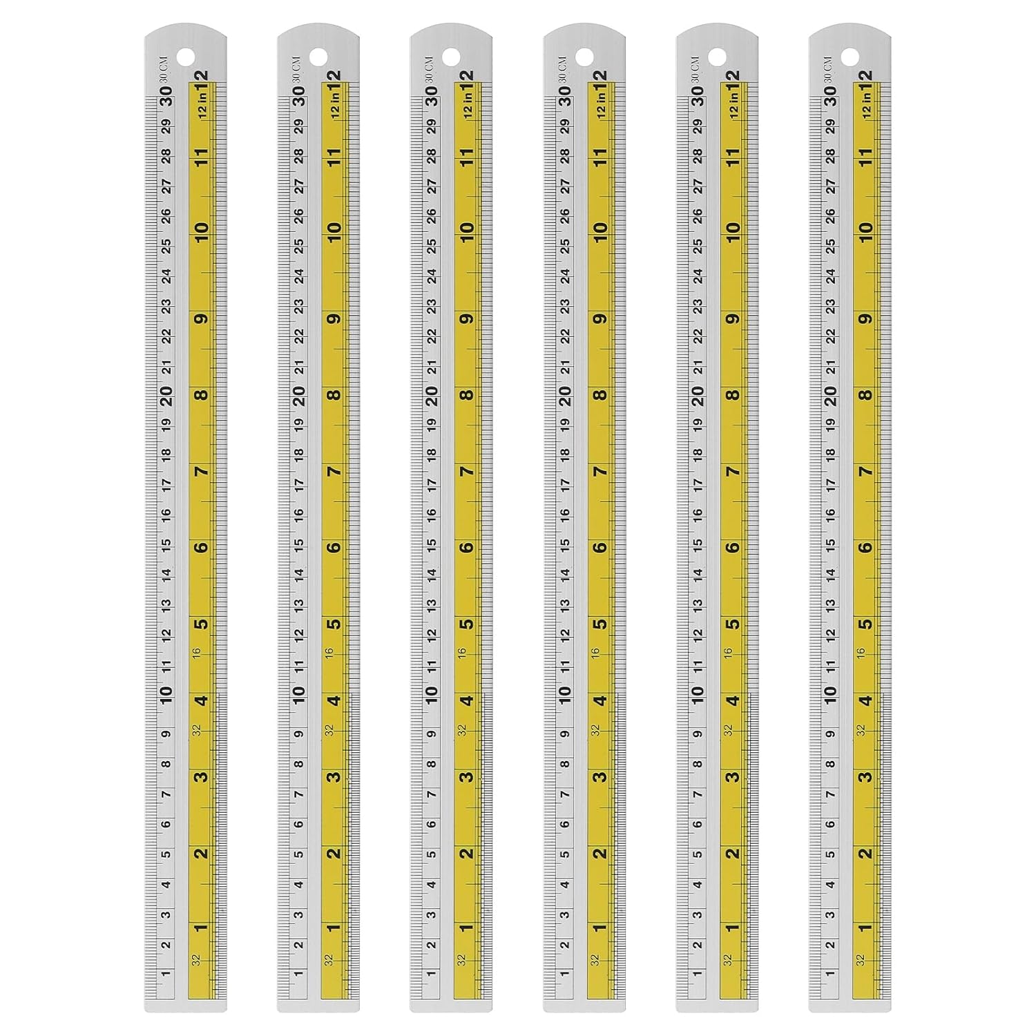 HARFINGTON 6pcs Metal Straight Ruler 30cm Metric SAE Aluminum Alloy Measuring Rulers Scale Tool with Hole for Measure Study Reading Classroom Office, Yellow