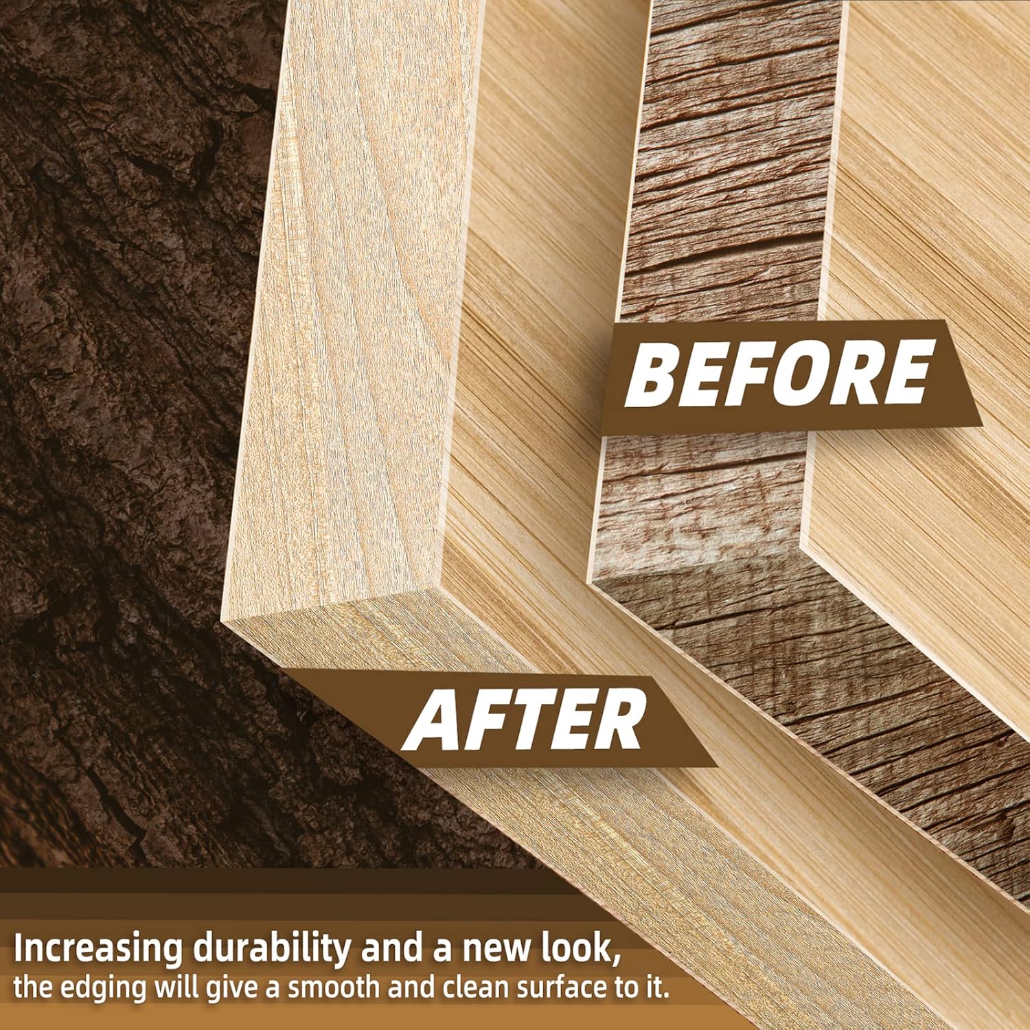 - √【UPGRADE DESIGN】- The size of Edge Banding is 3/4 inch x 500ft, and the thickness is 0.6mm, It's suitable for your daily needs. Edge Banding is a strip of wood veneer with heat melt adhesive pre-applied to the back. You simply hold the edge banding in place, then run over it with a heated iron. After cooling, please press it with your hand and trim off the sides with the Utility Knife, 0.6mm thickness can let you easy to do.