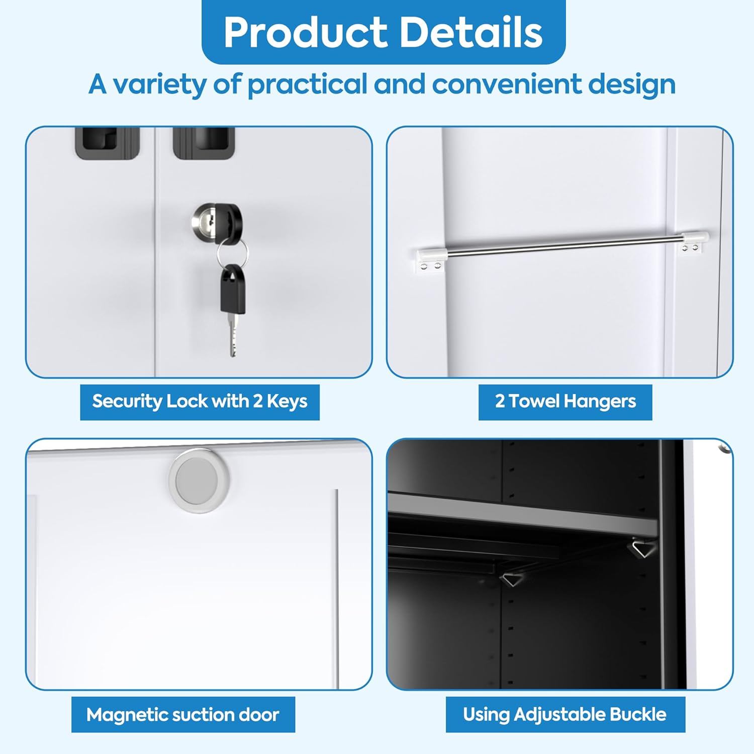 - [DIY YOUR STORAGE] Our storage cabinet provides 4 adjustable shelves, 3 pieces of Pegboard, 1 hanging rod, 2 towel rails, 6 hooks and 3 pegs, catering to your DIY needs. You can design a storage solution that perfectly fits your unique lifestyle and storage requirements.
