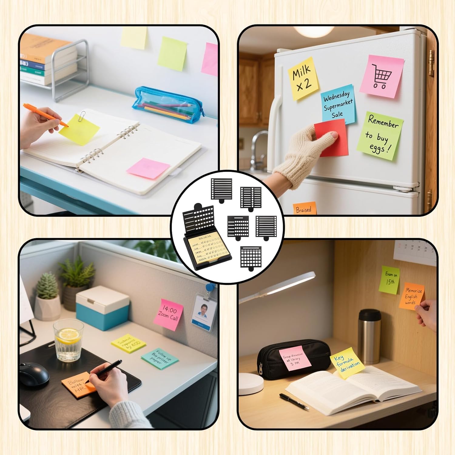 - 1 PCS 3x3 Notes Holder Set: The package includes a single sticky note holder, five distinct templates, and one pack of sticky notes to help you get started on your organizational tasks immediately. This all-in-one set is designed for convenience, providing a complete solution for anyone who wants to bring order to their office, home, or classroom workspace. The transparent design of the holder ensures the templates remain easily visible and accessible.
