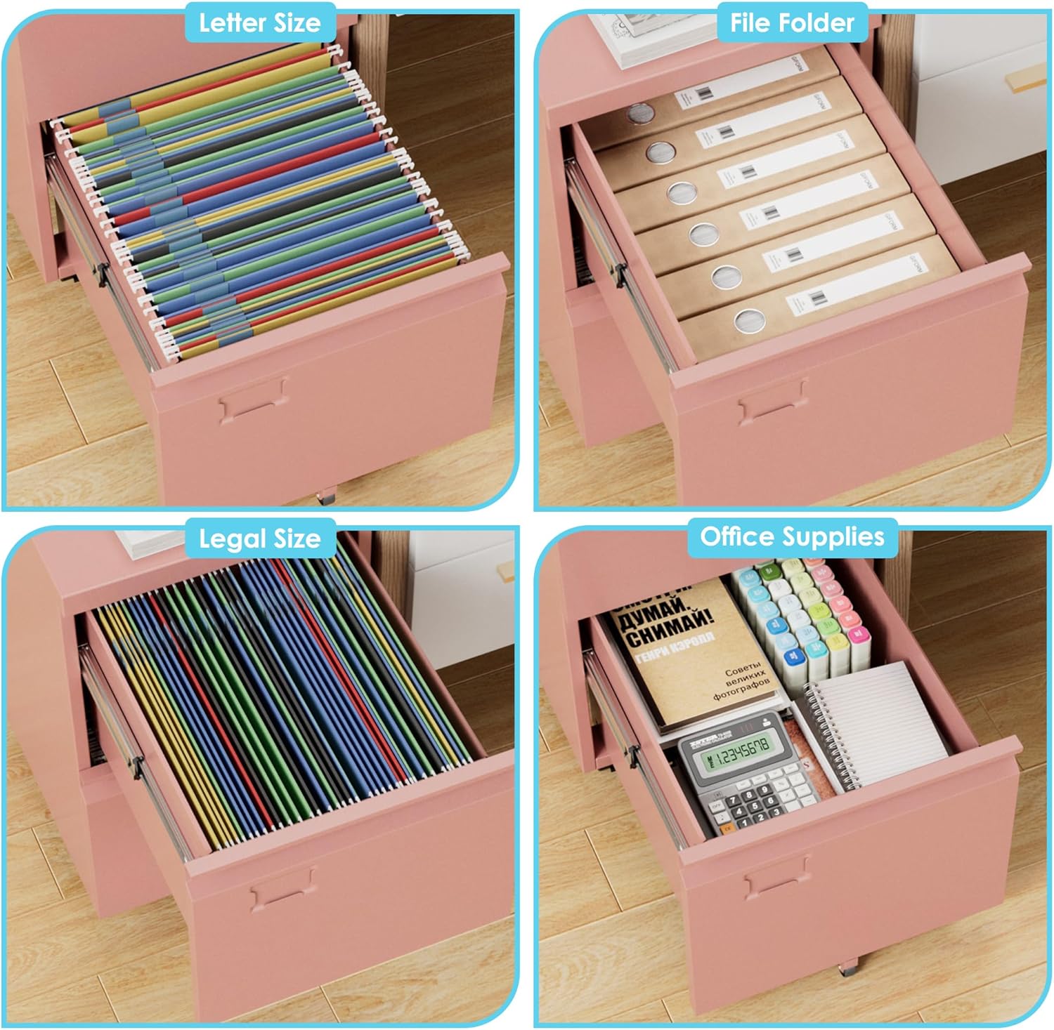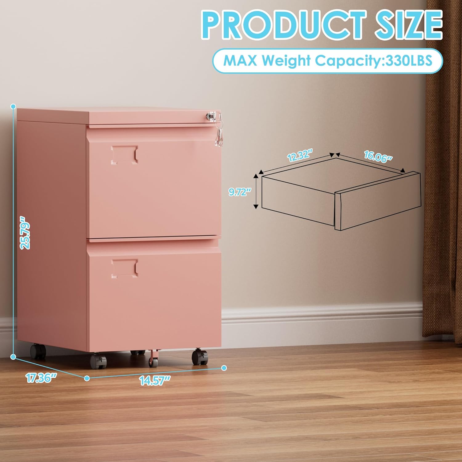 2 Drawer Mobile File Cabinet with Lock,Under Desk Metal Filing Cabinets for Home Office Fits Letters/Legal/A4 Size Folder, Assembly Required, Pink